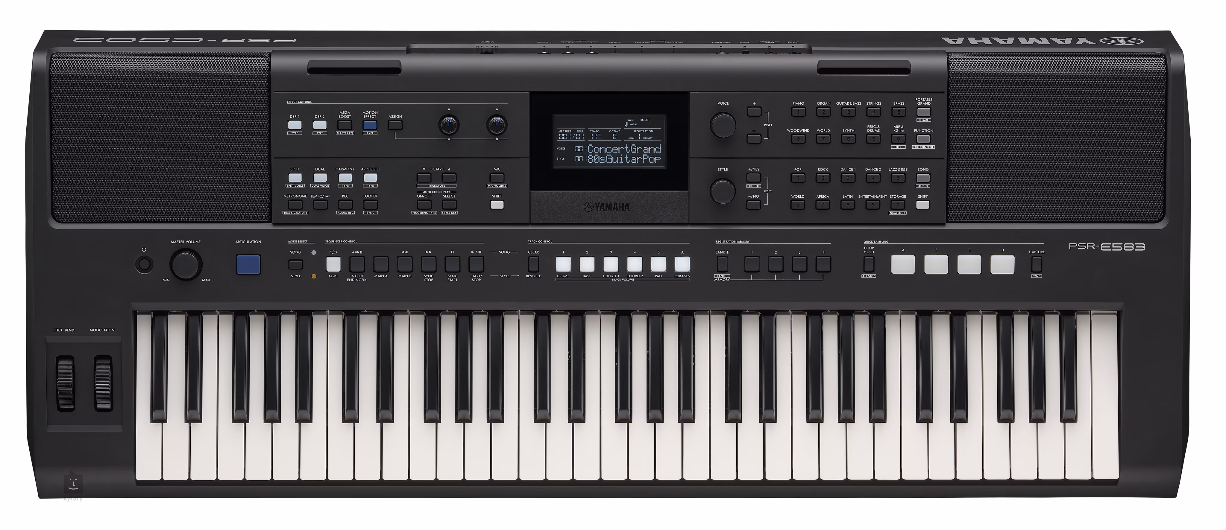 Yamaha PSR-E583 je všestranný přenosný keyboard se 61 dynamickými klávesami, který nabízí ideální rovnováhu mezi jednoduchým ovládáním a pokročilými funkcemi. Jedná se o nejvyšší model z řady PSR-E, což se projevuje zejména v bohaté zvukové knihovně, výkonném ozvučovacím systému a expresivním ovládání – na ovládacím panelu nechybí vedle pitch bendu modulační kolečko a k dispozici je také vstup pro externí expression pedál.